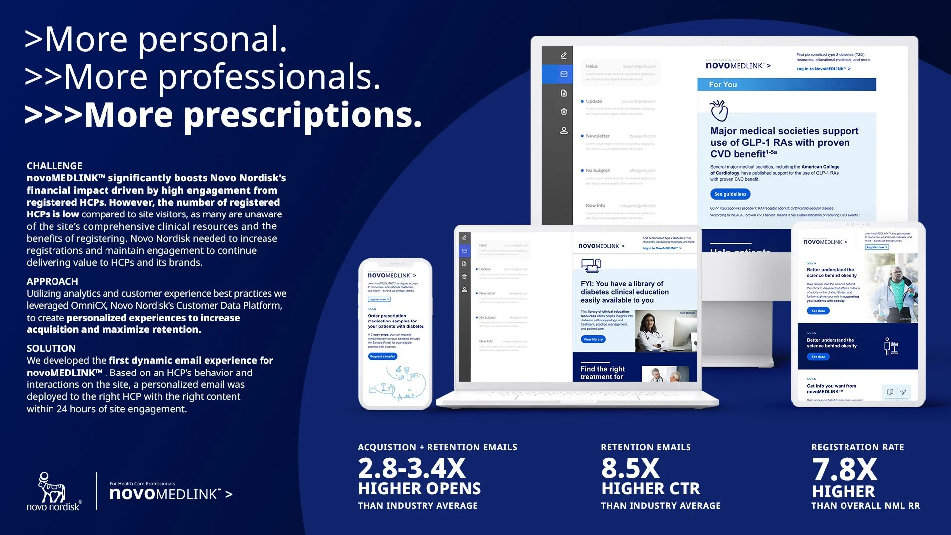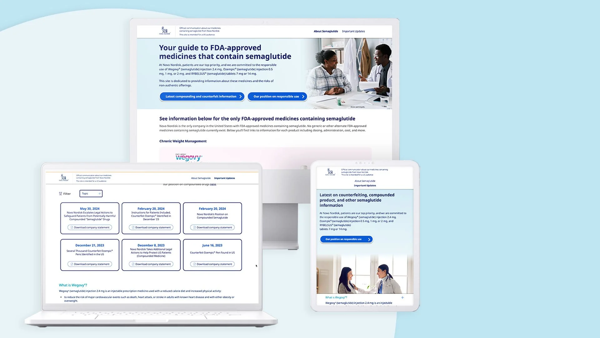 I lead a wide range of projects for Novo Nordisk across multiple brands, including Ozempic, Rybelsus, Rivfloza, and NovoMedLink. The work spanned various formats and platforms, with two featured projects highlighted here: the development of modular email templates and a website redesign.